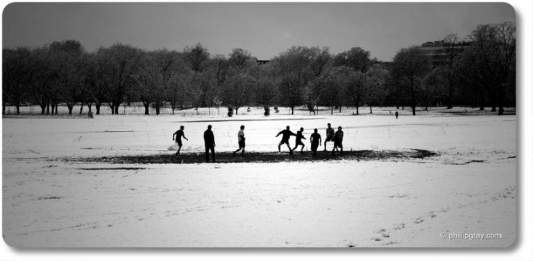 Regents Park London. Its dosen’t snow like this in London very often, but when it does its a magical sight. The snow often makes the UK grind to a halt, but it didn’t stop these guys showing up for their weekly football game.