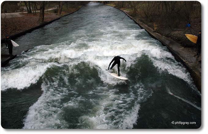 This is what they get up to in Munich, Germany on a small stream (the Eisbach) in the heart of the city. You would probably have to travel over 1000km from Munich to find any real surf.