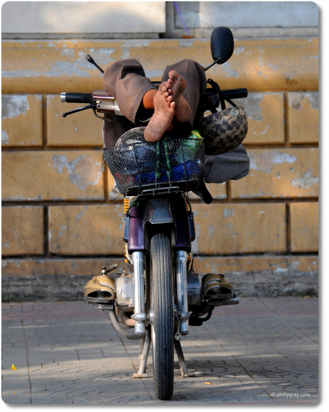 January 27, 2011January 19, 2011 sleeping on the job This guy is making the most out of nap time. I like how his slippers are neatly on the pedals. Ho Chi Minh City, Vietnam. Share: Click to share on Facebook (Opens in new window) Facebook Click to email a link to a friend (Opens in new window) Email Click to share on X (Opens in new window) X More Click to share on Reddit (Opens in new window) Reddit Like Loading... Related